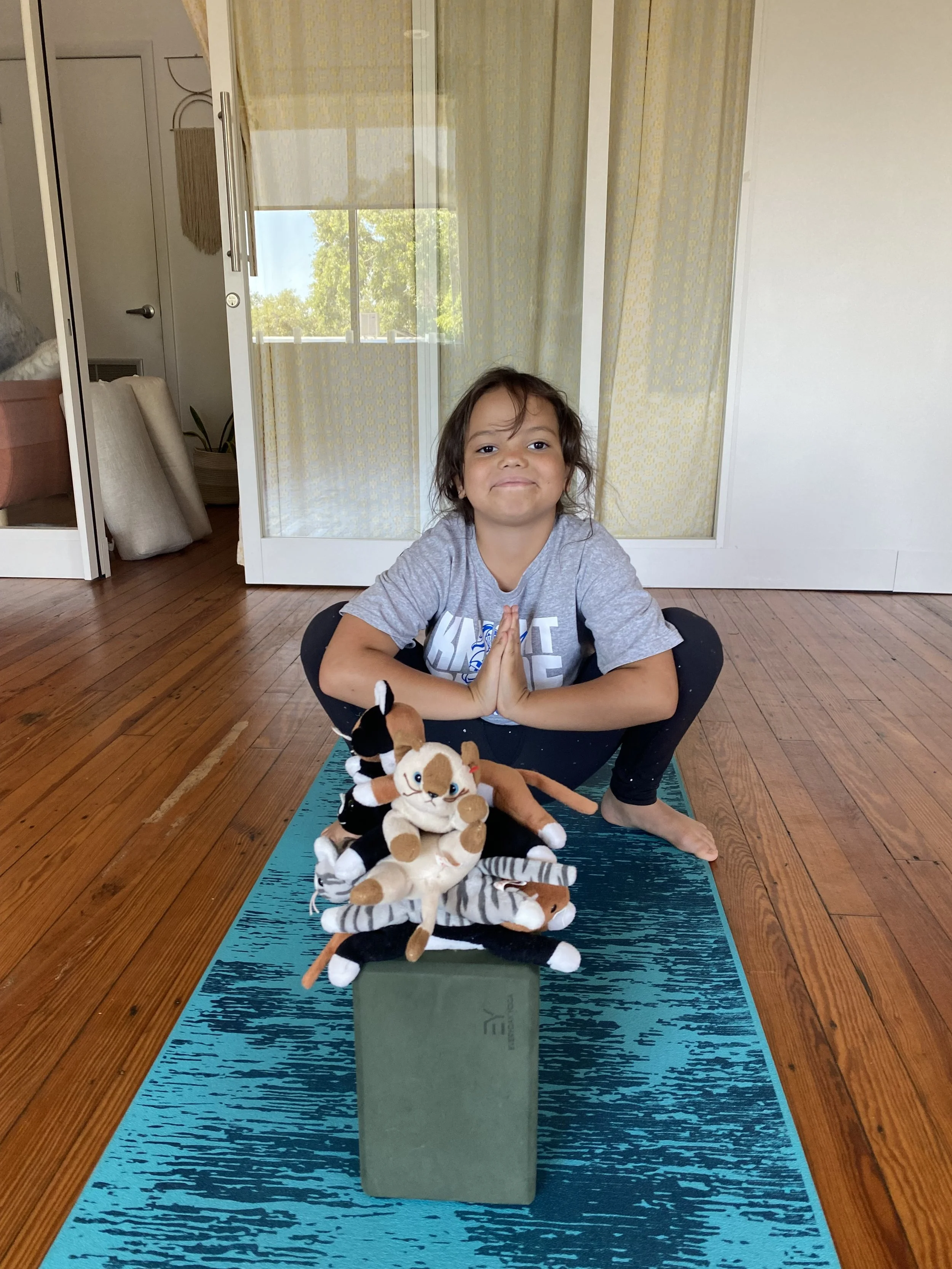 We start with a fun welcome activity, move into playful yoga (with poses inspired by your theme), add yoga games or storytelling, and finish with calming mindfulness or relaxation. If you select the Warrior Adventure or Artsy Deluxe package, the add-ons will take place after the traditional yoga class.